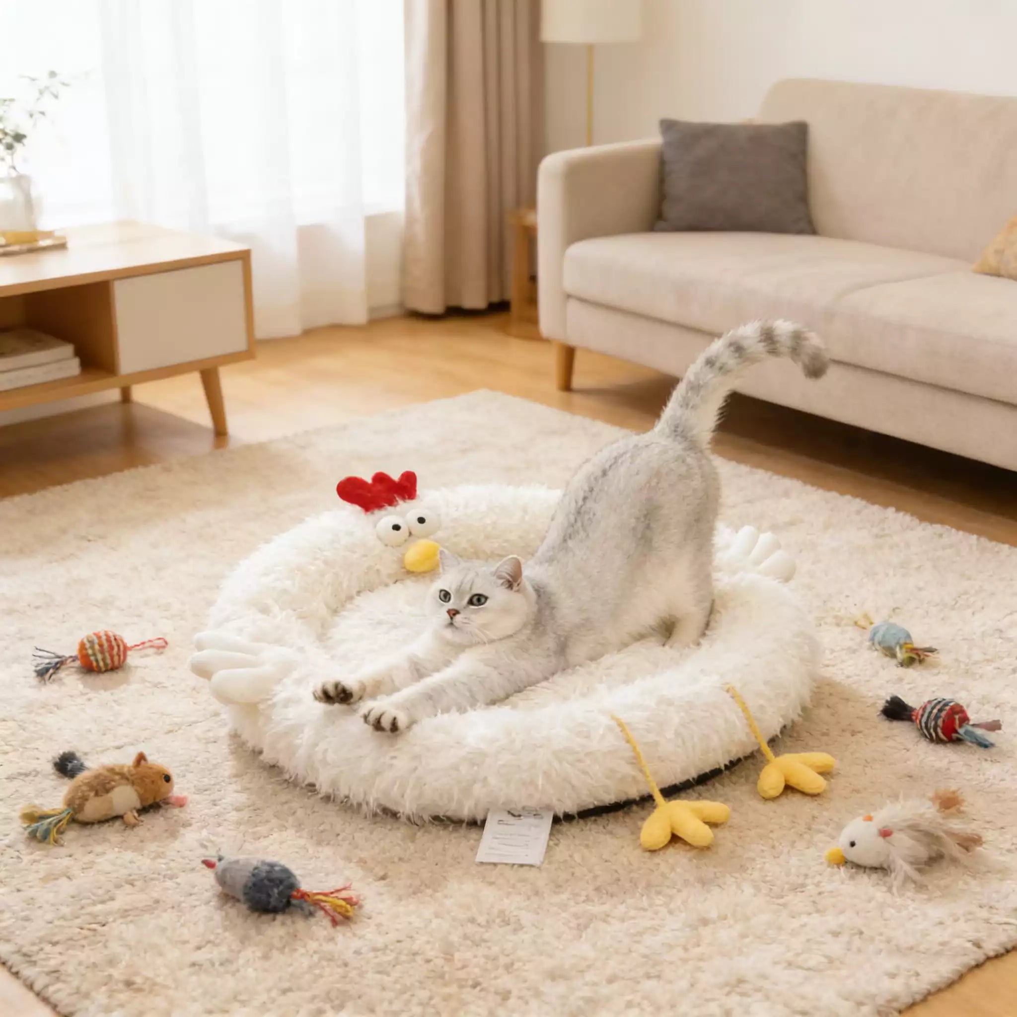 The Goo Chicken Cat Nest Mat ishand-crafted from Lion velvet(the same plush fabric used in luxury baby blankets) and filled withhigh-resilience PP cottonthat keeps its loft for years.